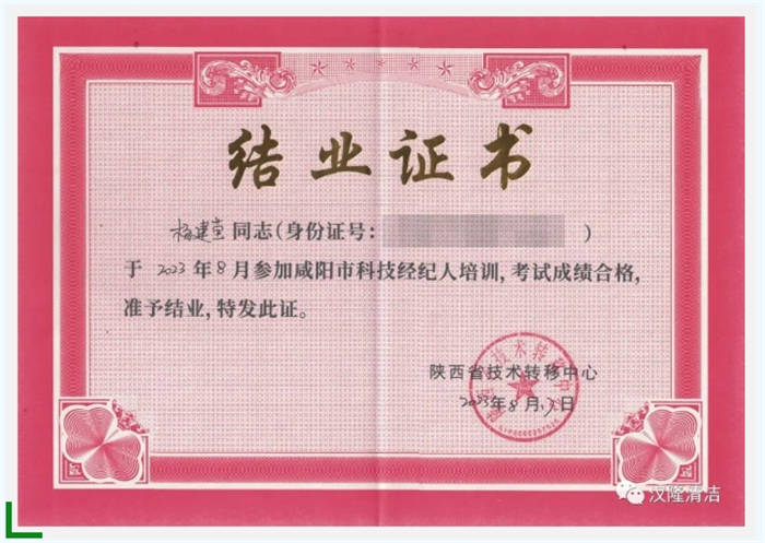 為提高企業(yè)的科技文化氛圍,提升企業(yè)科技成果轉化能力,漢隆公司副總經理楊建瑩參加了咸陽市舉辦的科技經紀人培訓,圓滿完成了培訓,考試成績合格,取得了“科技經紀人”證書!