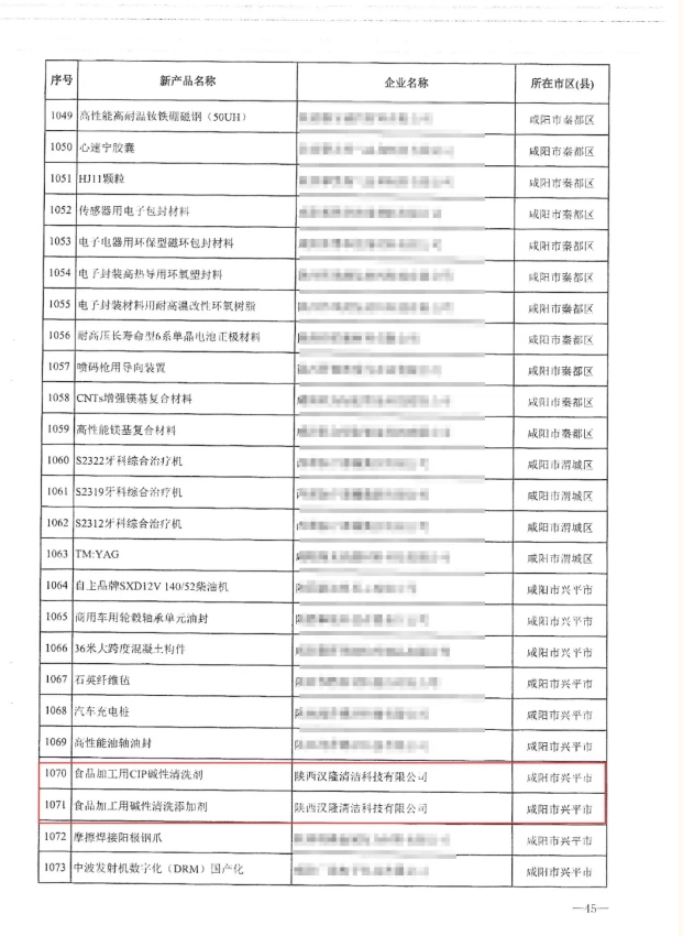 近日,陜西省工業(yè)和信息化廳正式發(fā)布《關(guān)于下達(dá)2025年陜西省重點(diǎn)新產(chǎn)品開發(fā)項(xiàng)目的通知》(陜工信發(fā)[2025]133號(hào)),陜西漢隆清潔科技有限公司自主研發(fā)的“食品加工用CIP堿性清洗劑”和“食品加工用堿性清洗添加劑”成功入選,標(biāo)志著公司在食品工業(yè)清潔技術(shù)領(lǐng)域的創(chuàng)新實(shí)力再獲權(quán)威認(rèn)可!