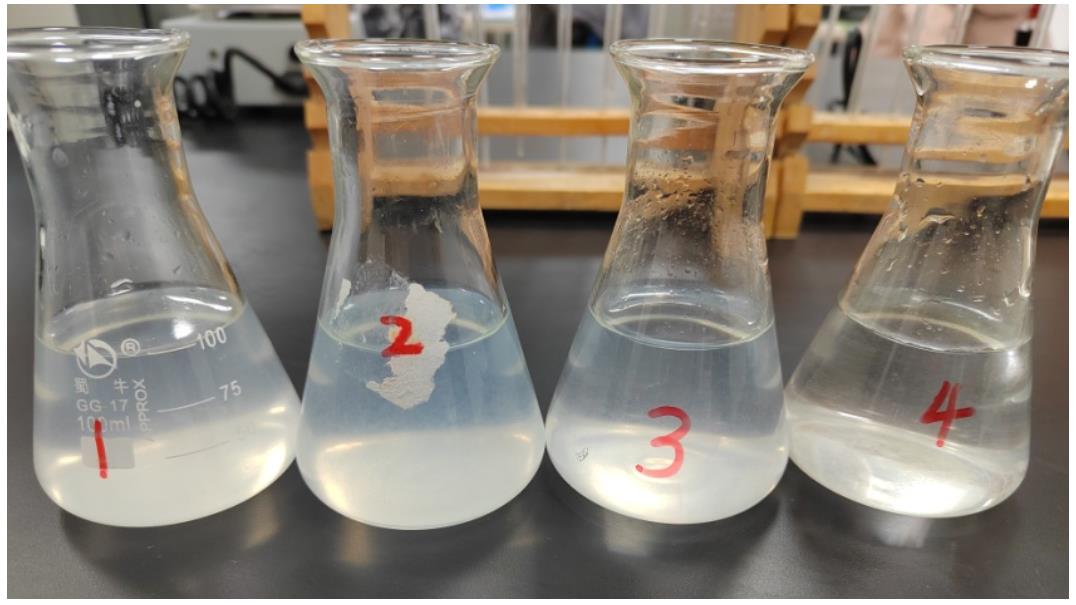稱取16.7g無(wú)水氯化鈣和24.7g硫酸鎂,溶解于10L水中配制硬水樣品,并將其稀釋為625mg/L硬度的水樣;分別取實(shí)驗(yàn)清洗劑樣品1~4(1-3為競(jìng)品,4為漢隆公司樣品),再依次加入625mg/L硬度的水,攪拌均勻后,硬水樣品變化如下:
